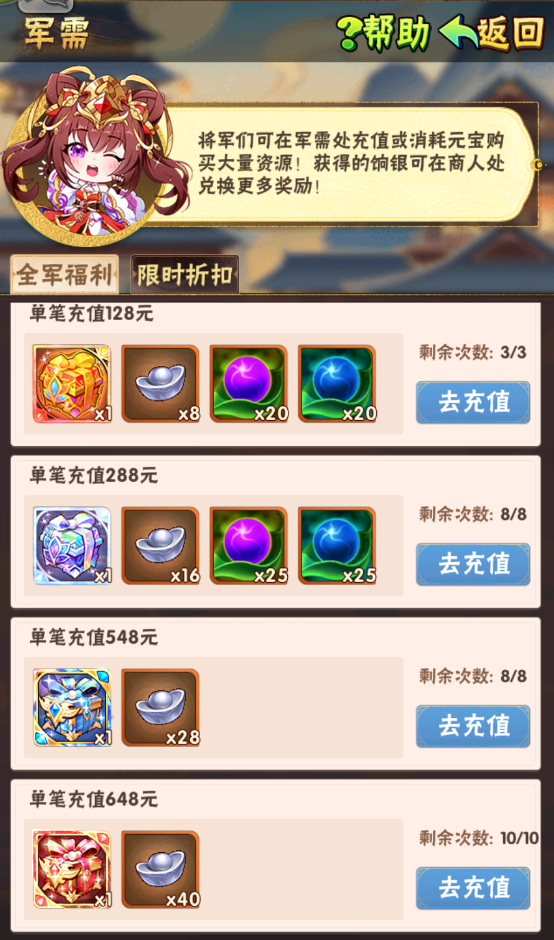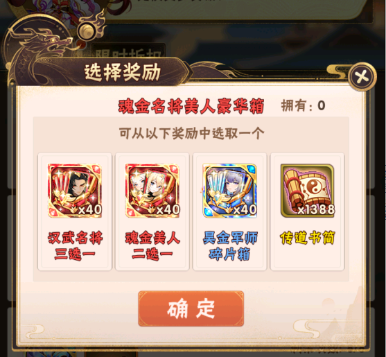 在活动期间少年们单笔充值至指定金额,即可获得汉武名将三选一、魂金美人二选一、昊金军师碎片箱、传道书简、饷银等资源: