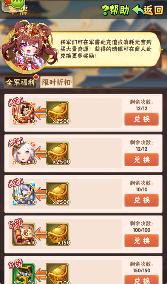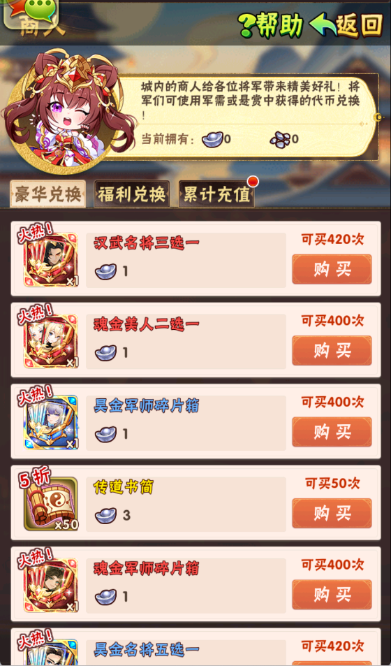 「饷银」可用来兑换汉武名将三选一、魂金美人二选一等稀有资源: