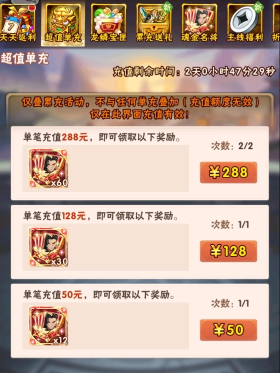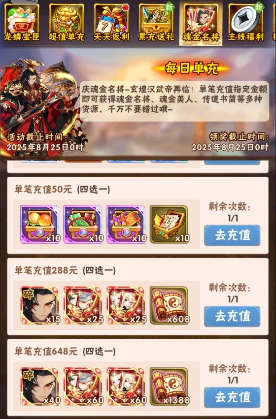 超值单充上架,魂金名将超值获取!