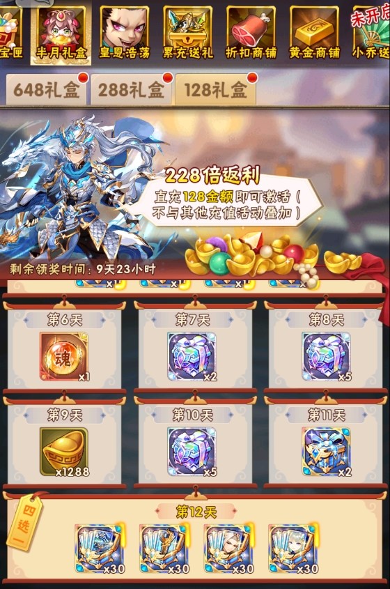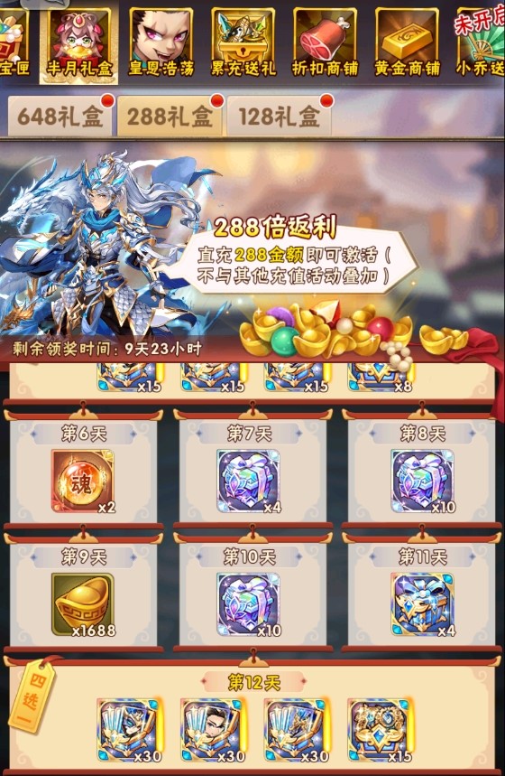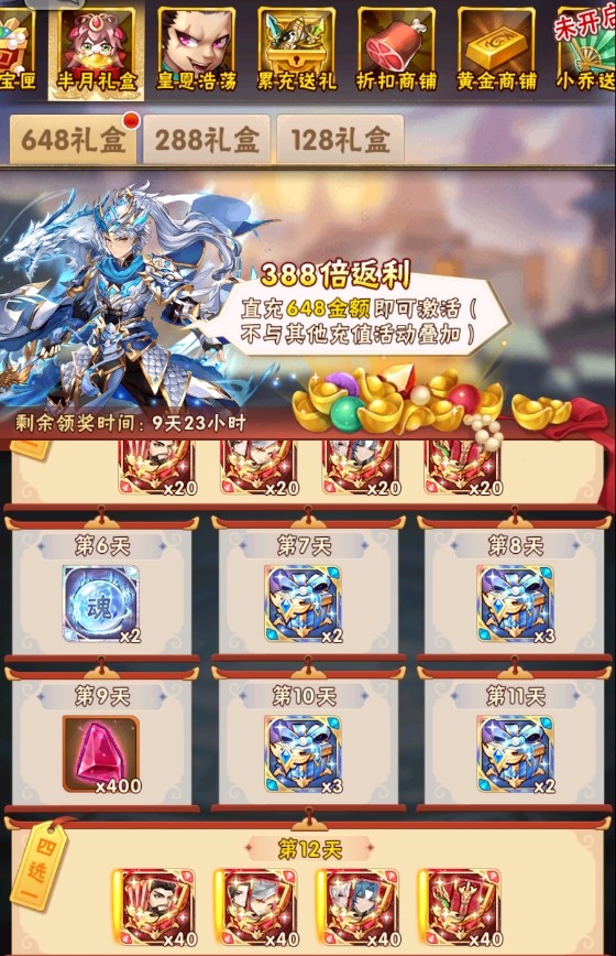 半月礼盒上架!各种魂金、昊金道具以及幻金魂将灵石重磅加入!养成资源加入幻金文物碎片自选箱、天灵秘籍、神迹晶骸、金丝、彩金战魂随机箱等稀有材料!每4天都可以领取到豪华魂金大礼,并且在最后一天还可领取翻倍奖励。