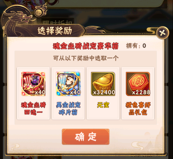 在活动期间少年们单笔充值至指定金额,即可获得魂金坐骑四选一、昊金战宠碎片箱、元宝、橙色喜好品礼包、饷银等资源: