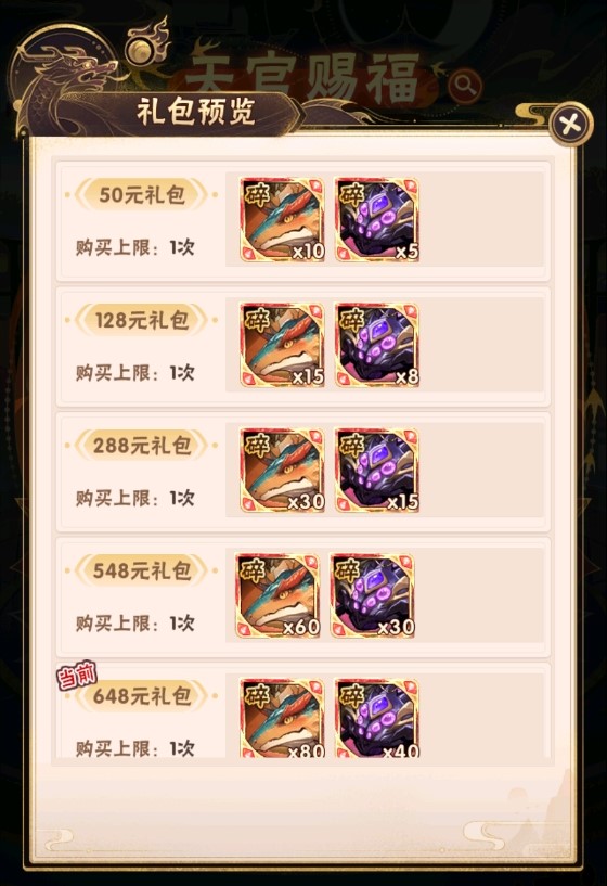 少年们单笔充值指定金额,即可得到青金碧灵虬碎片、幽焰暗棘蛛碎片等珍稀道具!当前档位礼包购买后,方可购买下一档位礼包!优惠多多,不容错过!