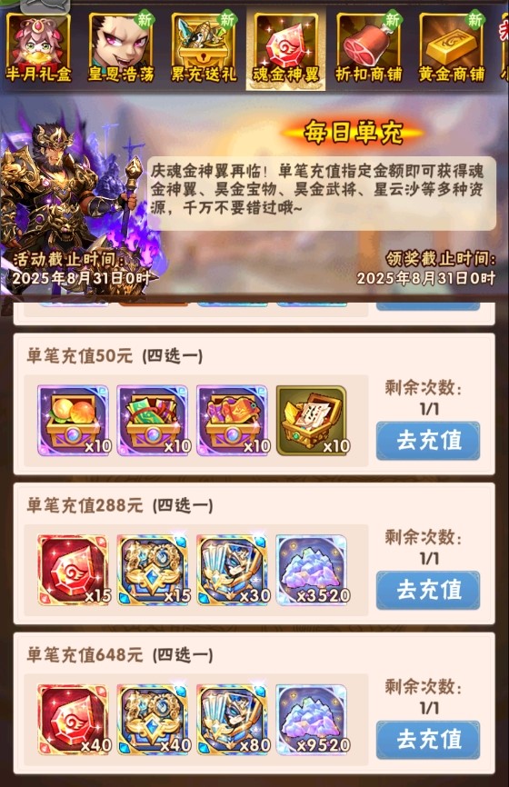 活动一、每日单充 魂金神翼