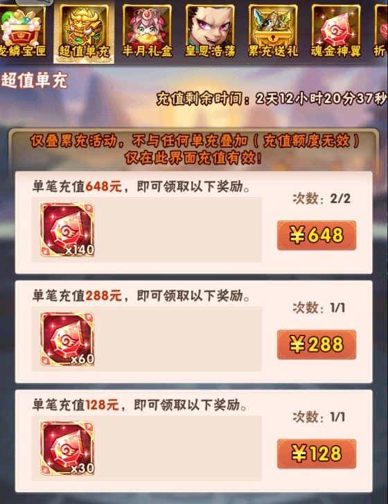1.超值单充的充值额度计入“限时活动”中累充活动的累计充值额度;