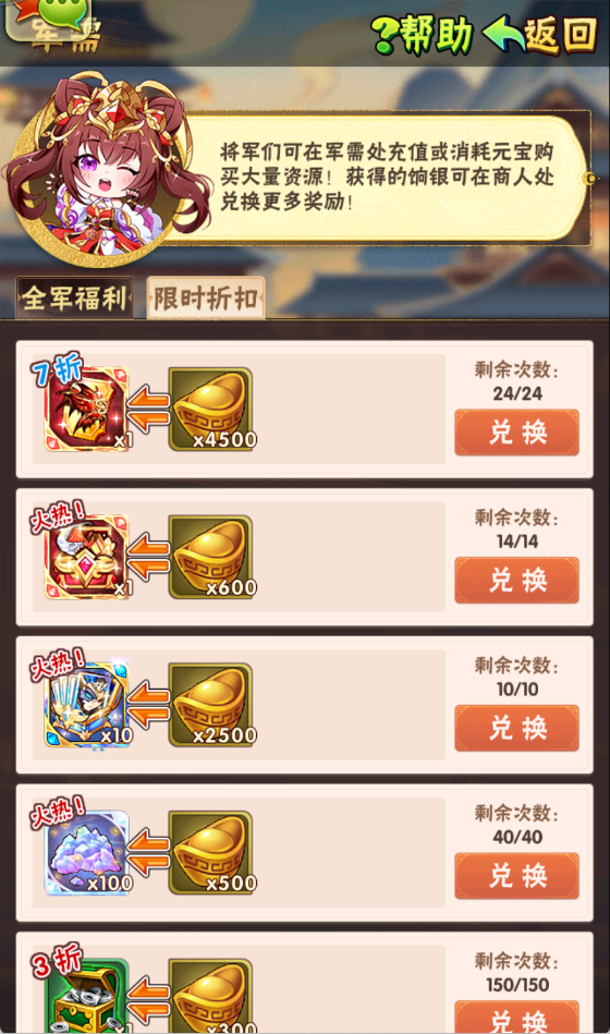 纵横八方折扣商店限时促销,折扣低至2折,用元宝就能购买大量稀缺资源!快来选购吧。