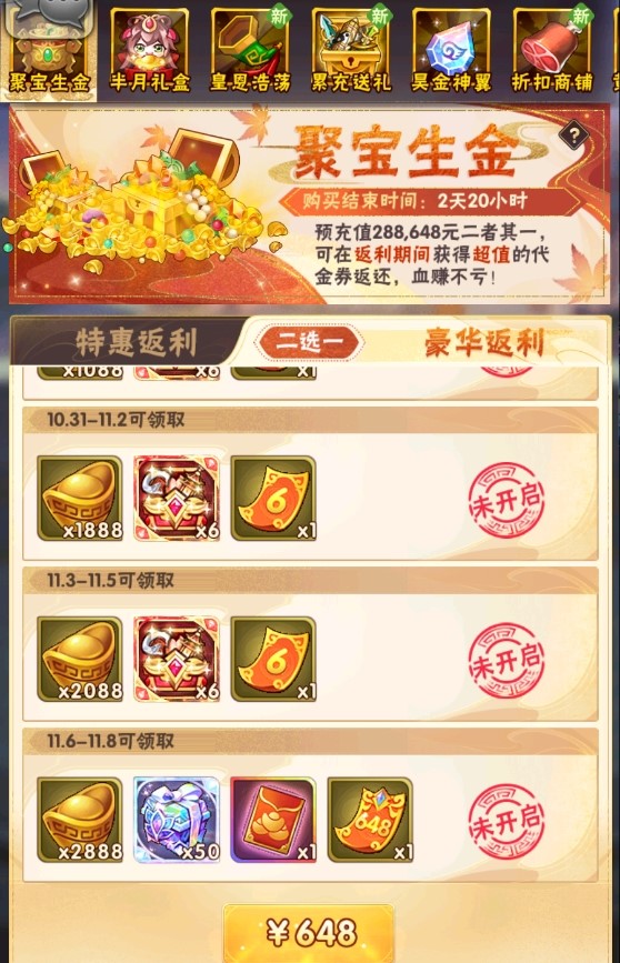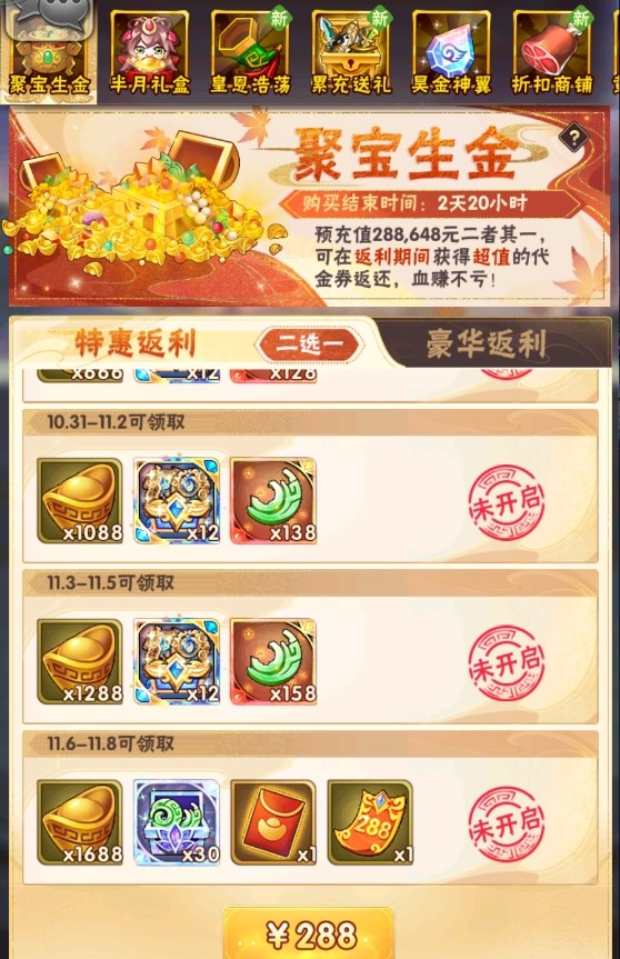 少年们单笔充值指定金额,即可立即获得海量元宝及稀有养成材料礼包「星韵镶玉养成包」,返利期还可获得288/648元限时代金券、昊金/魂金宝物等豪华大礼!少年们千万不要错过哟~
