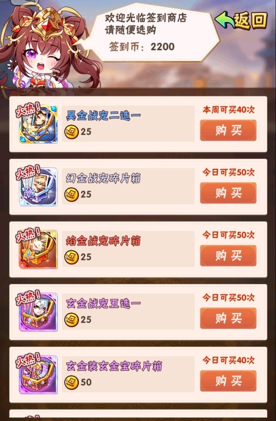 3、「欢乐铜币」可以兑换:幻金武将碎片箱、幻金名将五选一、幻金装碎片任选箱、幻金宝碎片任选箱、幻金军师碎片箱、幻金战宠碎片箱、幻金坐骑六选一、幻金神兵碎片箱、霸王项羽碎片、焰金胚子集合包等。
