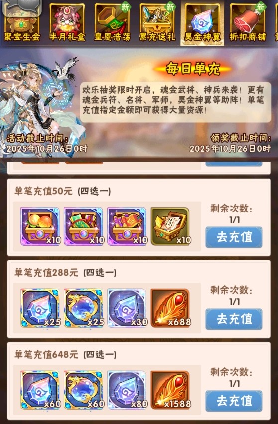 2、「欢乐银币」可以兑换:魂金名将二选一、魂金军师四选一、昊金神翼合成卡、碧浪滔天旗碎片、昊金装碎片任选箱、昊金宝碎片任选箱、昊金战宠碎片箱、昊金神兵碎片箱、幻金神翼合成卡、幻金兵符六选一、幻鹿莲魂旗碎片、幻金胚子集合包等。