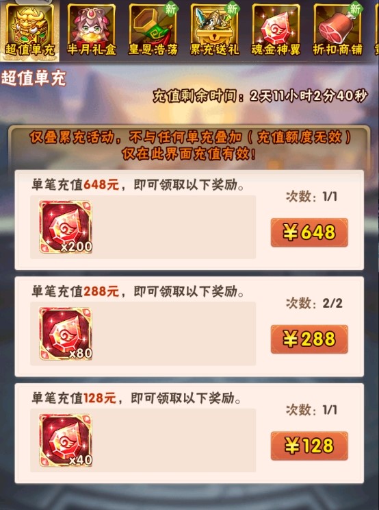 2.超值单充的充值额度计入“英雄回归”中累充活动的累计充值额度;