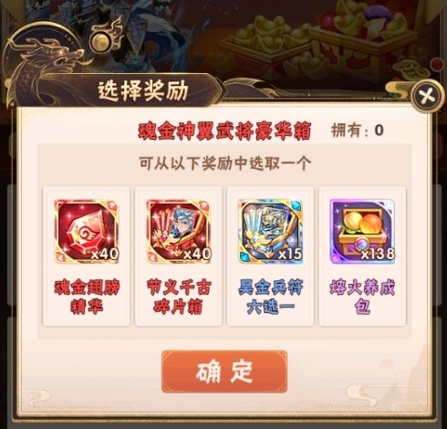 在活动期间少年们单笔充值至指定金额,即可获得魂金翅膀精华、节义千古碎片箱、昊金兵符六选一、熔火养成包、购物卡等资源: