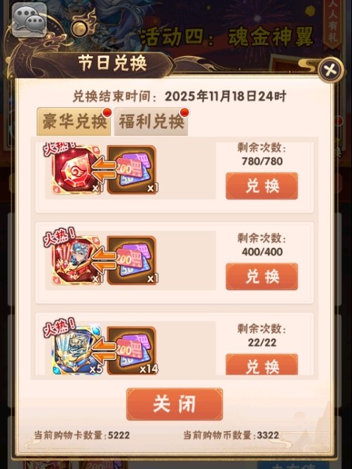 「购物卡」可用来兑换魂金翅膀精华、节义千古碎片箱等稀有资源: