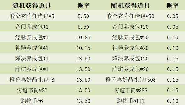 3.「双十一礼盒」可开出:购物币*111、彩金玄阵任选包*50、奇门养成包*20、经脉养成包*20、神器养成包*20、阵法养成包*20、阵道养成包*20、橙色喜好品礼包*308、传道书简*888、购物币*6、彩金玄阵任选包*5、奇门养成包*1、经脉养成包1、神器养成包*1、阵法养成包*1、阵道养成包*1、橙色喜好品礼包*8、传道书简*22中的随机1种。