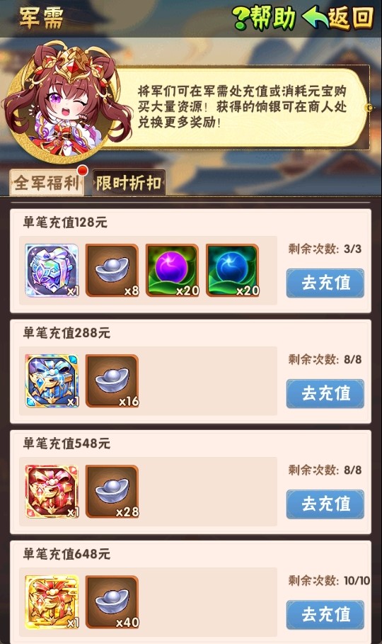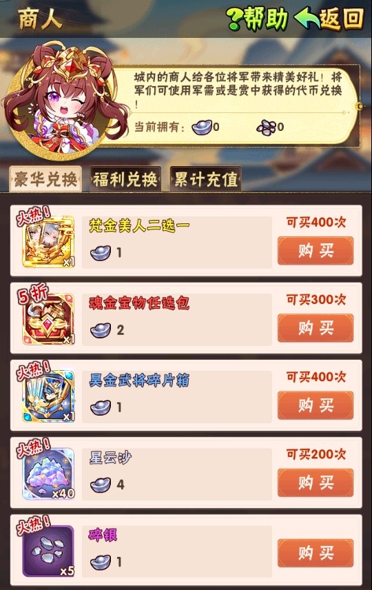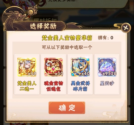 在活动期间少年们单笔充值至指定金额,即可获得梵金美人二选一、魂金宝物任选包、昊金武将碎片箱、星云沙、饷银等资源: