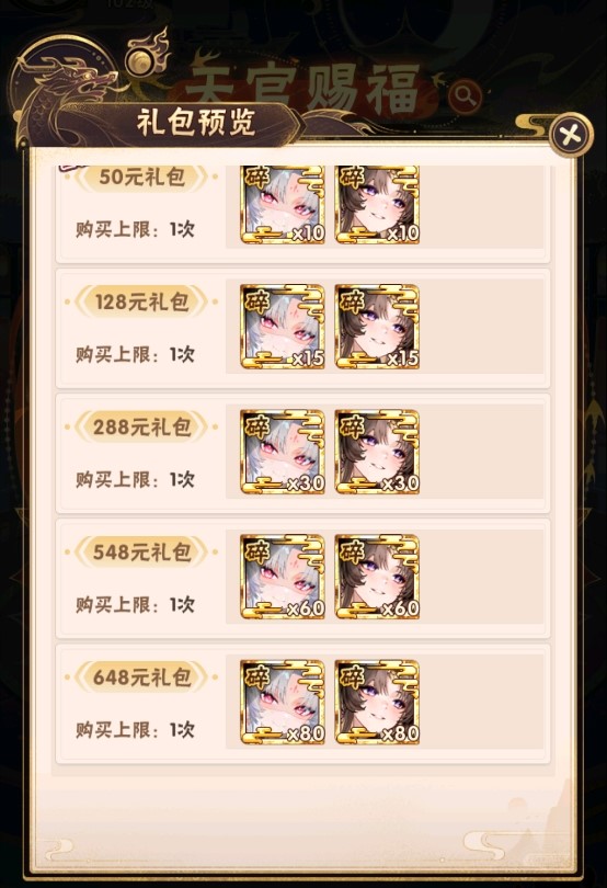 少年们购买礼包后,即可获取绛韵西施碎片、艳逸虞姬碎片!当前档位礼包购买后,方可购买下一档位礼包!优惠多多,不容错过!