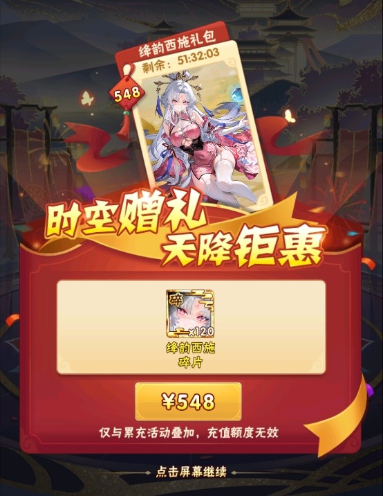 1.时空礼包的充值额度计入“限时活动”中累充活动的累计充值额度;
