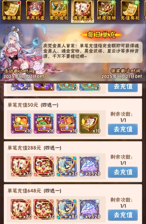 活动一、每日单充 魂金美人