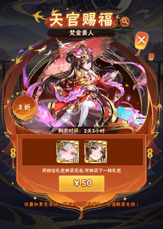 4.天官赐福的充值不与任何形式的单充活动叠加,如:欢庆佳节中单笔充值活动、天天返利、月基金、周基金、月卡、豪华签到等。