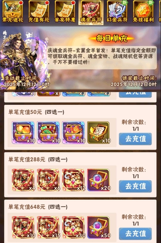 活动一、每日单充 魂金兵符