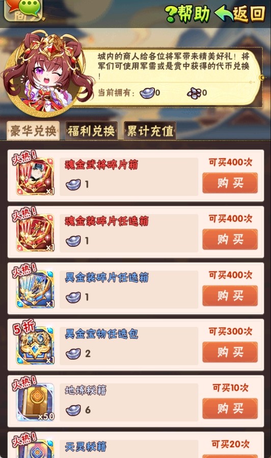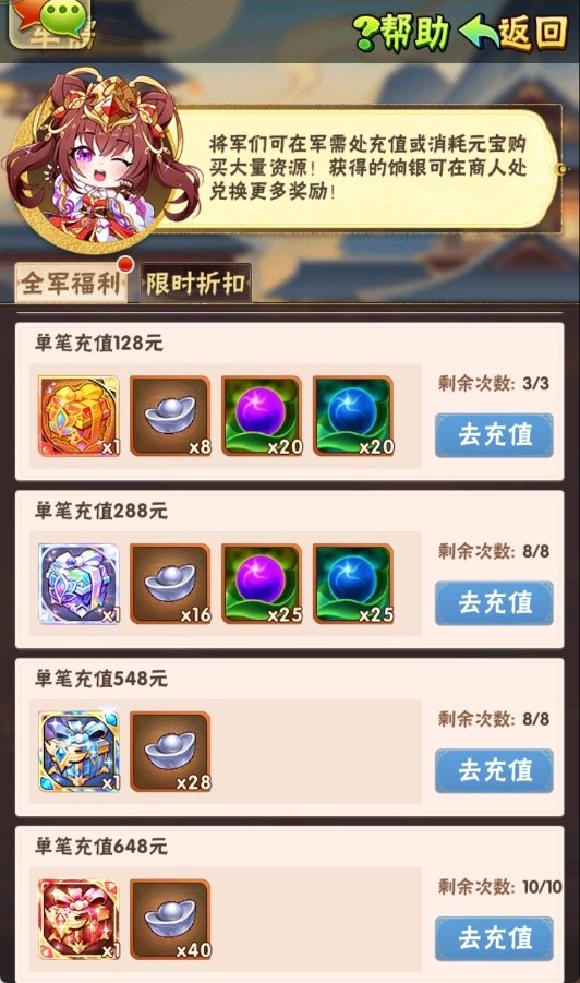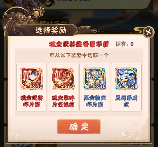 少年们购买礼包后,即可获取魂金武将碎片箱!当前档位礼包购买后,方可购买下一档位礼包!优惠多多,不容错过!