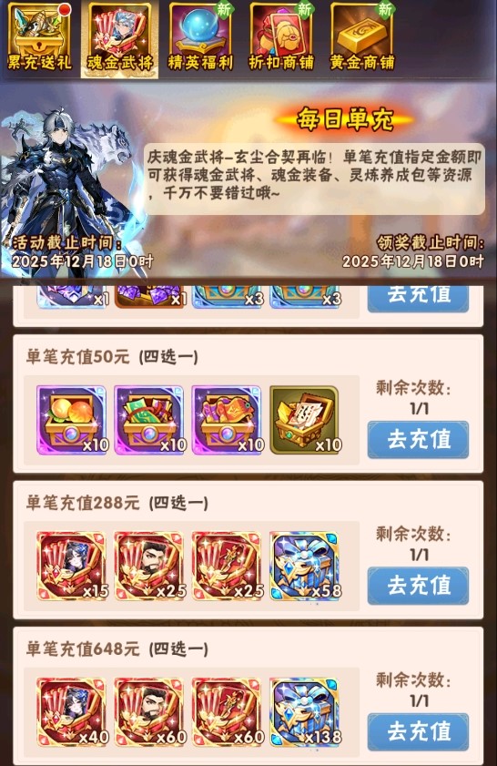 活动一、每日单充 魂金武将