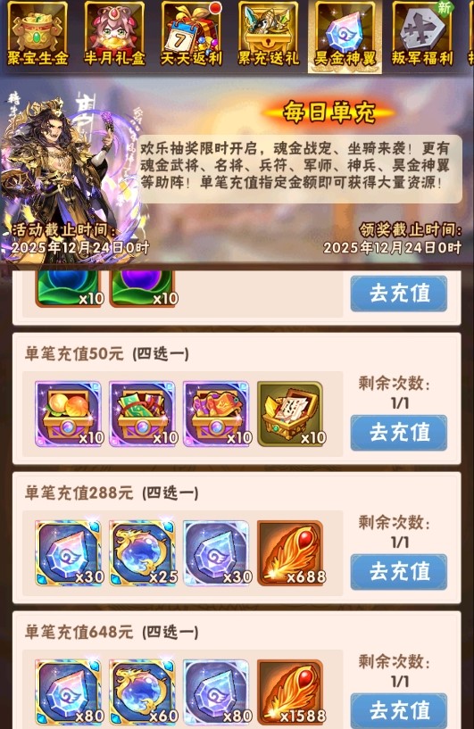 鸣夏·翠蝉战宠、青金幽焰坐骑加入奖池!魂金武将、名将、兵符、军师、神兵等多种道具等你获取!周基金开启,魂金名将、魂金战宠等不容错过!天天返利上线,50、128元档位多种奖励可选,魂金武将、魂金坐骑等任君挑选!聚宝生金超值上线,海量元宝等你获取,充值指定金额还可获得288/648元限时代金券等豪华大礼!签到领福利,昊金坐骑加入豪华兑换!