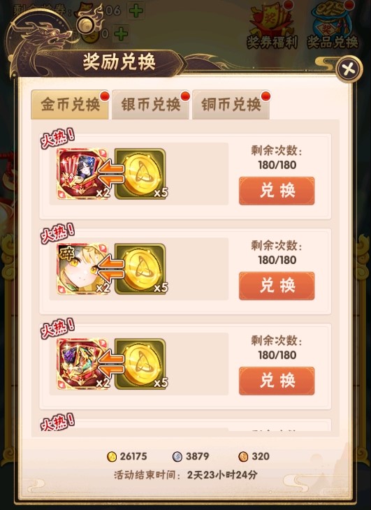 活动中的欢乐金币、欢乐银币、欢乐铜币、奖券道具在奖励兑换结束时间后会消失,请及时兑换。