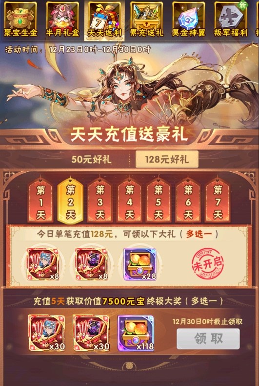 活动规则:活动期间每日单笔充值50/128元,就可以领取当日超值返利,累计充值5天还可以免费领取终极大奖!