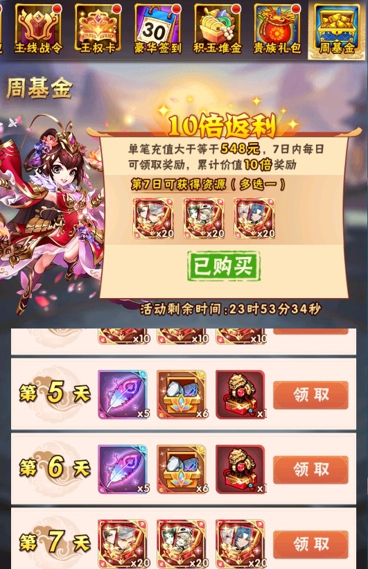 活动规则:在活动期间,7天内任意1天充值548及以上,都能立即激活周基金,领取当前天数所有奖励!