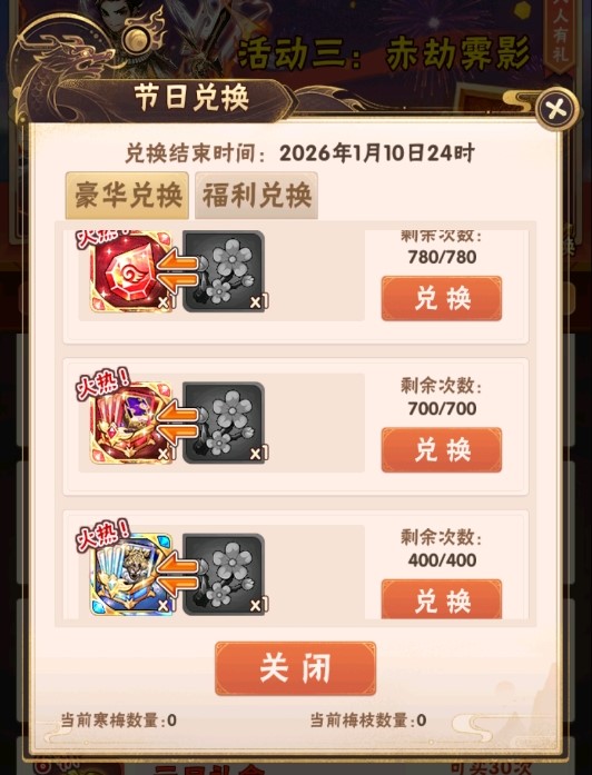 2.「寒梅」、「梅枝」可以兑换各种高级稀有资源,详情请登录游戏查看。