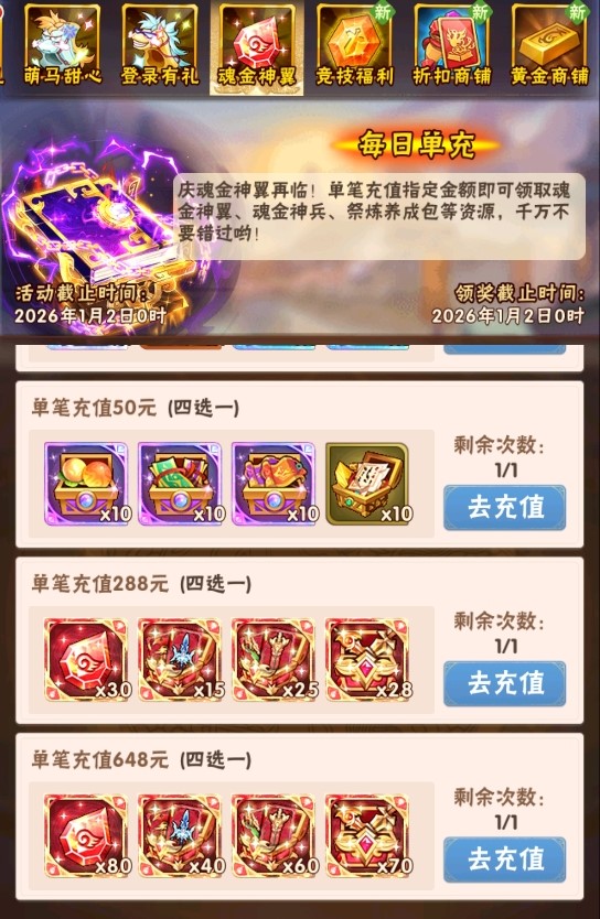 少年们单笔充值指定金额,即可得到魂金翅膀精华、龙魂赤炼碎片箱、魂金神兵二选一、祭炼养成包等珍稀道具!并且可以和欢庆佳节中的充值活动叠加,千万不要错过哟~
