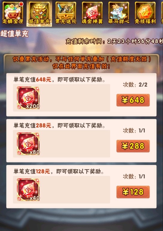 2.超值单充的充值额度计入“英雄回归”中累充活动的累计充值额度;