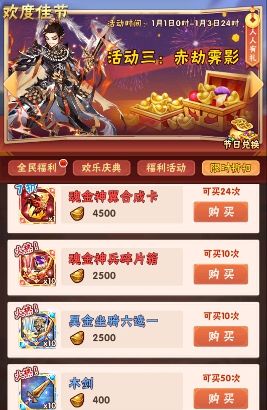 元旦欢庆折扣商店限时促销,折扣低至2折,用元宝就能购买大量稀缺资源!快来选购吧。