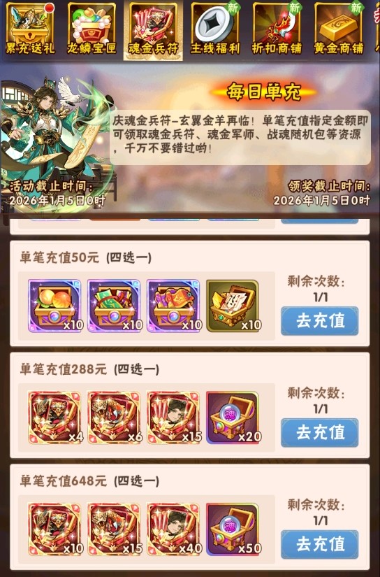 活动一、每日单充 魂金兵符