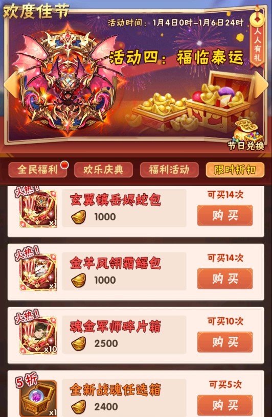 元旦欢庆折扣商店限时促销,折扣低至2折,用元宝就能购买大量稀缺资源!快来选购吧。