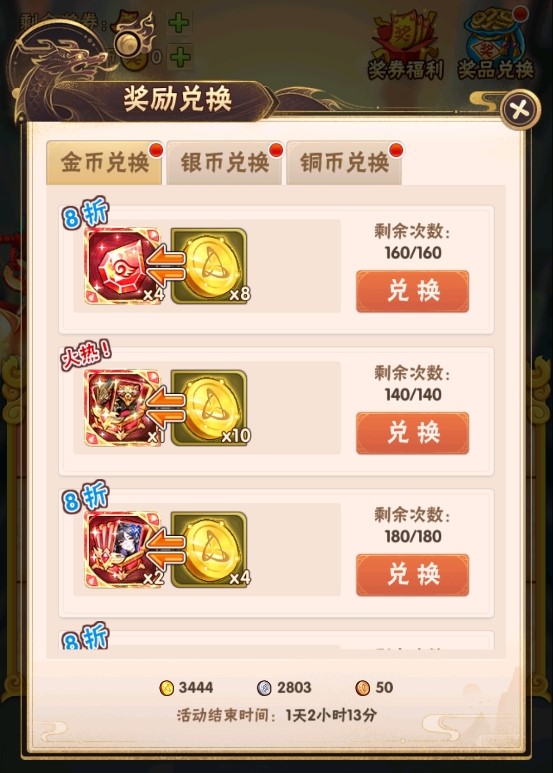 活动中的欢乐金币、欢乐银币、欢乐铜币、奖券道具在奖励兑换结束时间后会消失,请及时兑换。