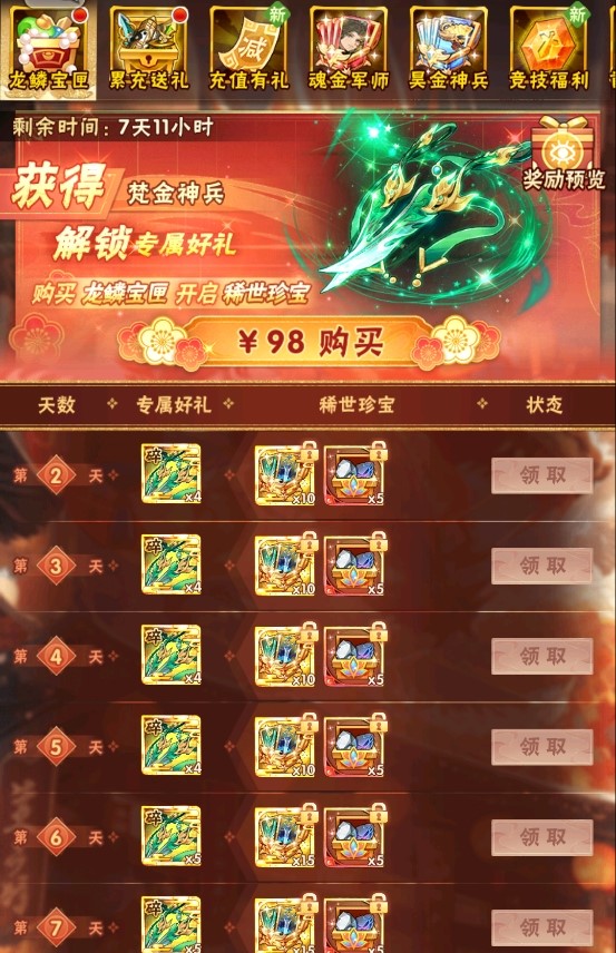 庆梵金神兵首发!少年拥有任一梵金神兵即可激活龙鳞宝匣,每日登录即可获得阴阳咒影刃碎片!充值98元还可额外解锁稀世珍宝,大量梵金神兵二选一、玄锻养成包等好礼不容错过!