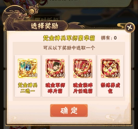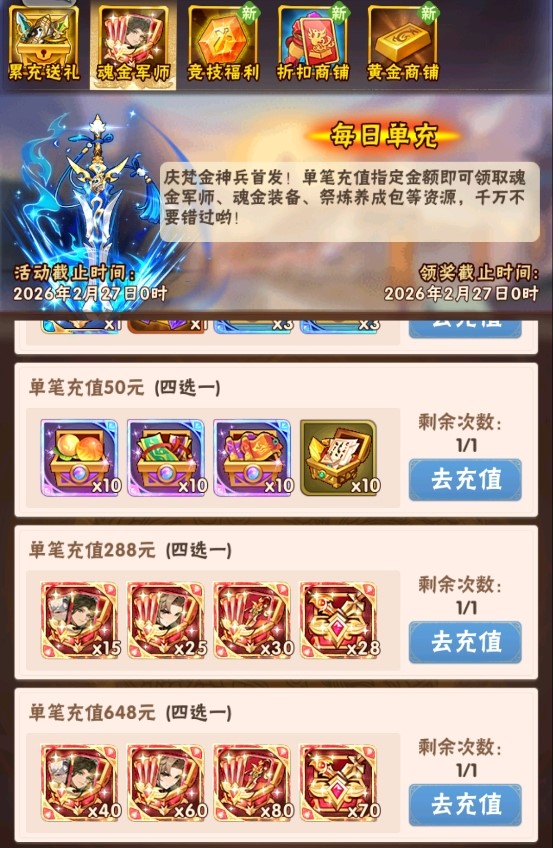 在活动期间少年们单笔充值至指定金额,即可获得梵金神兵二选一、魂金军师碎片箱、魂金装碎片任选箱、祭炼养成包、饷银等资源:
