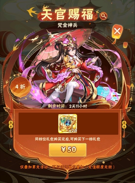 4.天官赐福的充值不与任何形式的单充活动叠加,如:欢庆佳节中单笔充值活动、天天返利、月基金、周基金、月卡、豪华签到等。