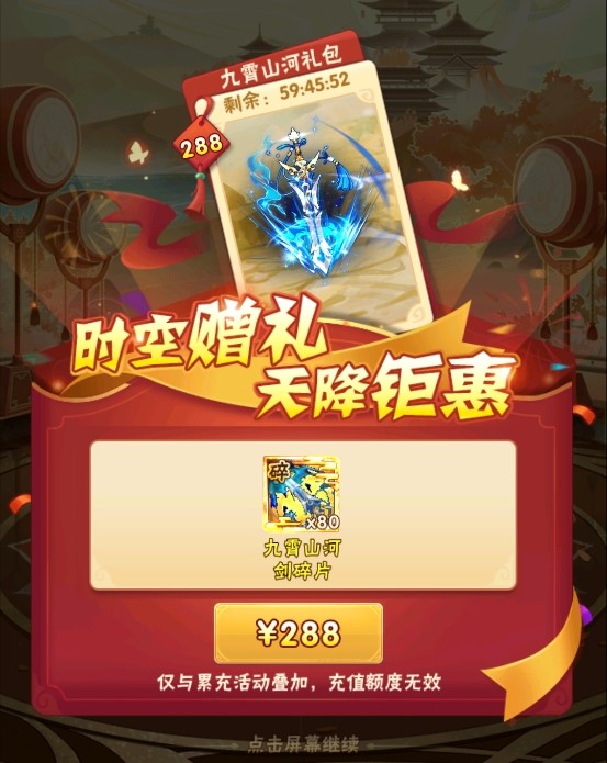 1.时空礼包的充值额度计入“限时活动”中累充活动的累计充值额度;
