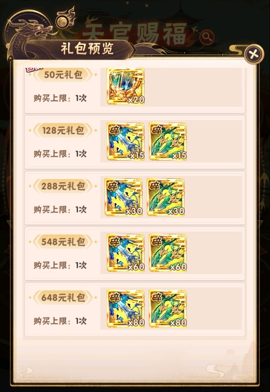 3.天官赐福的充值会正常赠送对应额度的黄金;
