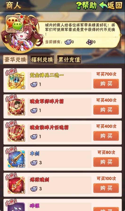 「饷银」可用来兑换梵金神兵二选一、魂金军师碎片箱、魂金装碎片任选箱等稀有资源: