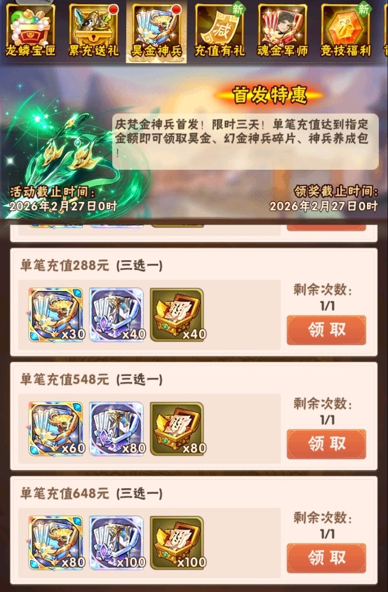 庆梵金神兵首发!限时三天,单笔充值达到指定金额即可领取大量昊金、幻金神兵碎片及养成资源!还可以与其他活动叠加!