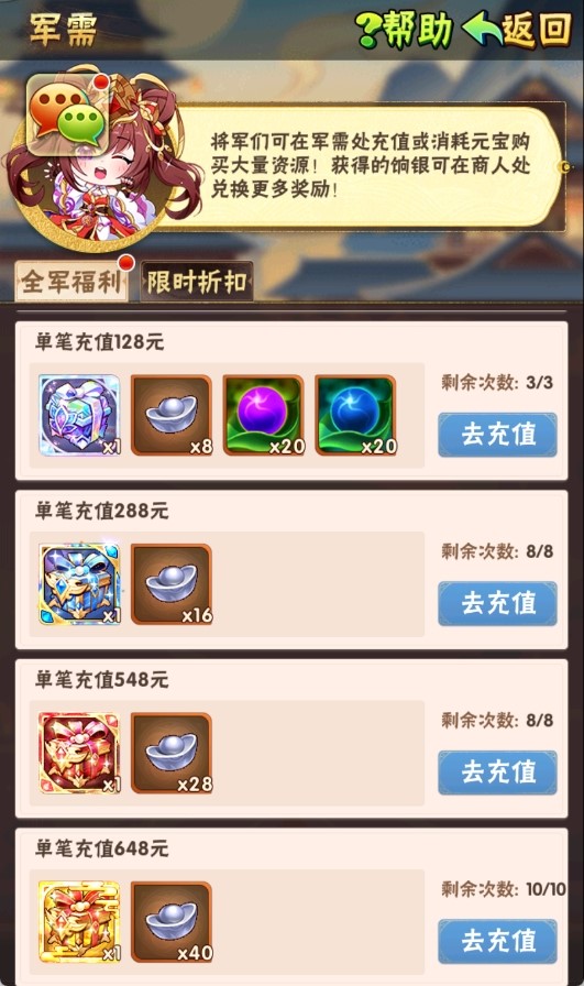 少年们单笔充值指定金额,即可得到盟智双辉碎片箱、魂金军师四选一、魂金装碎片任选箱、祭炼养成包等珍稀道具!并且可以和纵横八方中的充值活动叠加,千万不要错过哟~