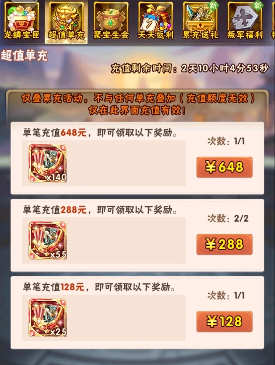 2.超值单充的充值额度计入“英雄回归”中累充活动的累计充值额度;